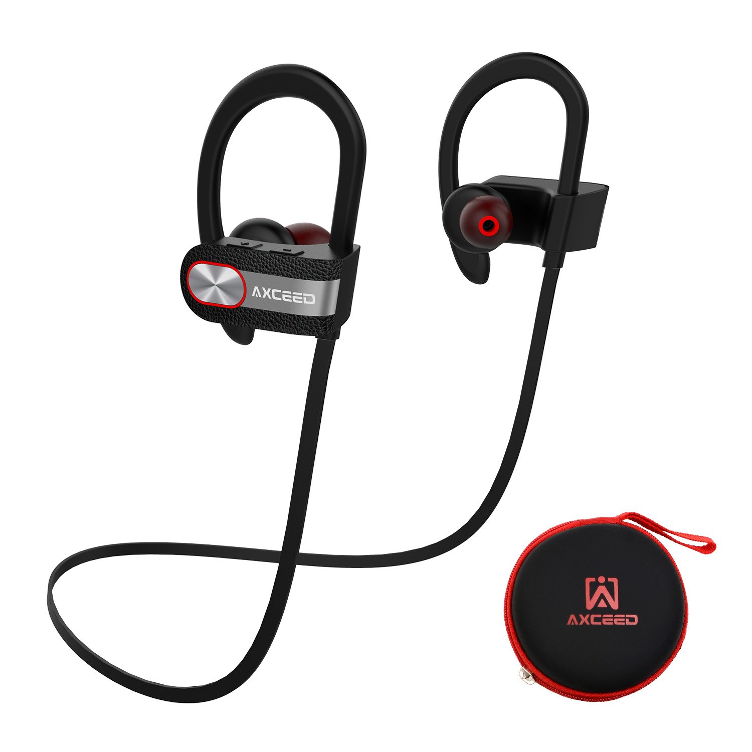 Axceed Wireless Sport Earphone CSR4.1 Sweatproof Bluetooth Headphone with Mic Secure Ear Hooks Design Surface Leather Texture Stereo DSP Noise Cancelling Headset Carrying Case Black